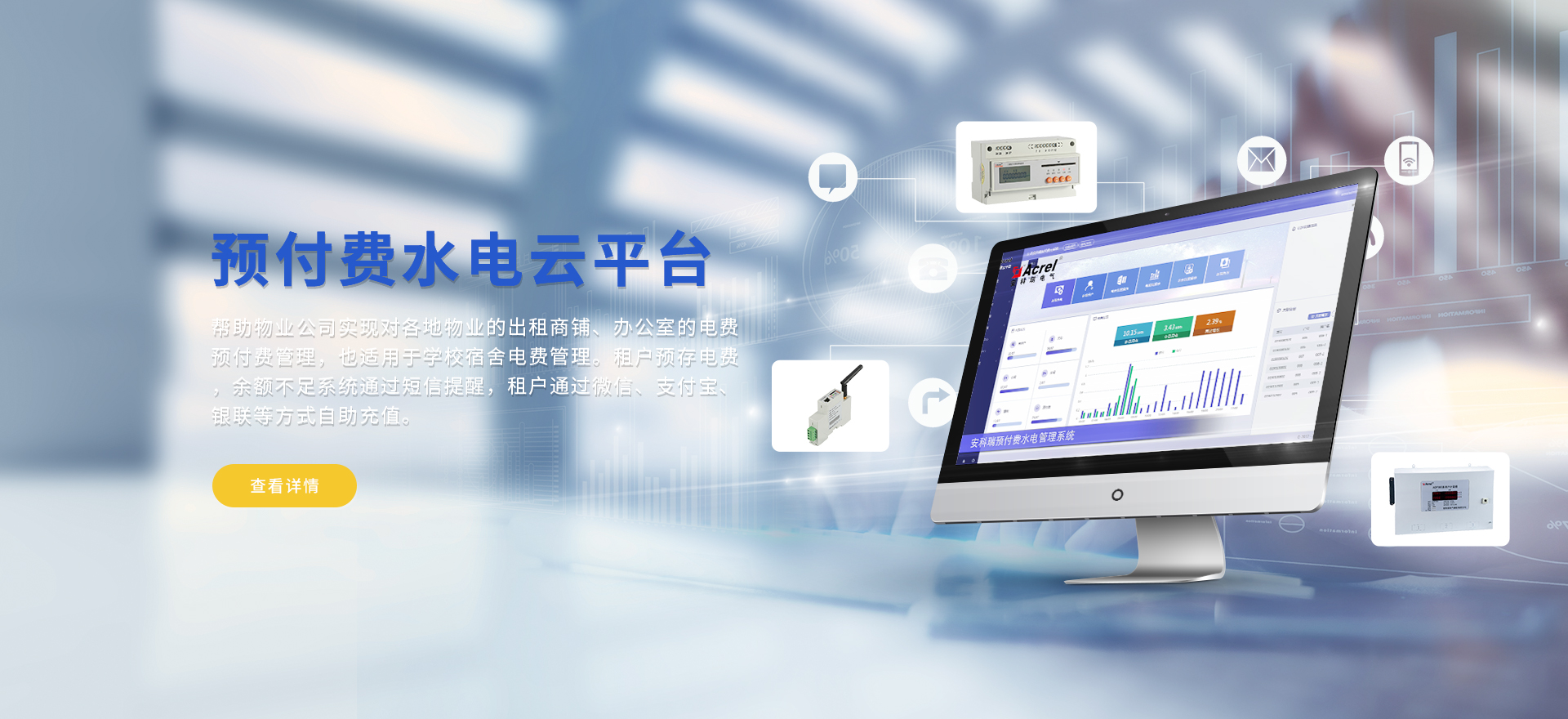 安科瑞提供的解決方案包括Acrel-EIoT能源物聯網云平臺變電所運維云平臺、安全用電管理云平臺、環保用電監管云平臺智慧消防云平臺、能源管理云平臺、工業企業能源管控平臺、遠程預付費云平臺、餐飲油煙監管云平臺電動汽車/電瓶車充電樁收費管理云平臺、電力監控/無線測溫系統、電能質量治理系統、電氣火災監控系統消防設備電源監控系統、防火門監控系統應急照明和疏散指示系統、智能照明控制系統、醫用隔離電源絕緣監測系統等,幫助用戶實現能源智能化、可視化、精細化管理,提高用能效率和用能安全,為企業節能降耗和實現能源數字化建設提供數據服務。